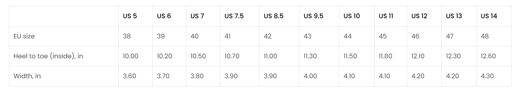 | Heel to toe (inside), in | 10.00 | 10.20 | 10.50 | 10.70 | 11.00 | 11.30 | 11.50 | 11.80 | 12.10 | 12.30 | 12.60 |
